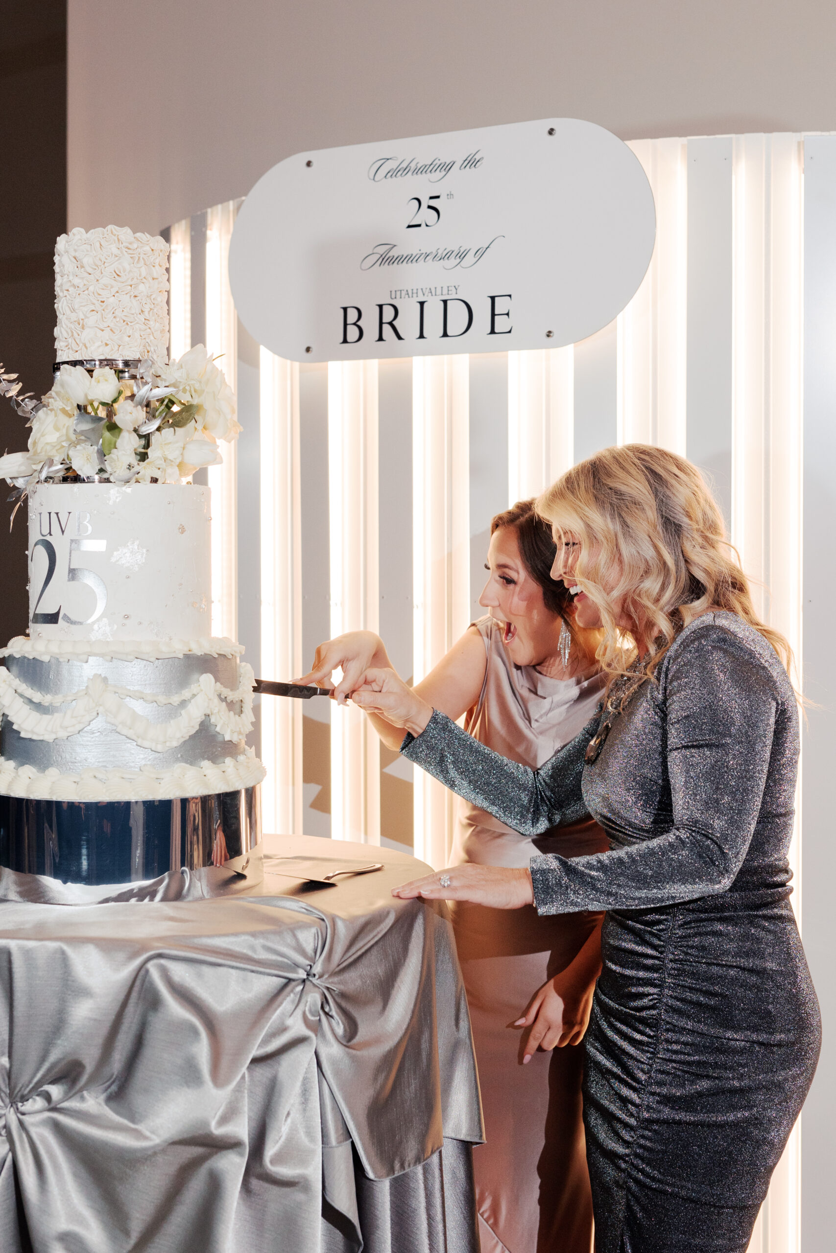 We invite you to revel in the silver with us as we kick off our 25th anniversary of Utah Valley Bride! To say it was a joy beyond measure to celebrate with everyone who came to our launch party is simply not doing enough justice. From the insanely gorgeous draping to the hundreds of hand-painted florals and the sparkle and shine from every glittery gown, it was a night we will never forget.