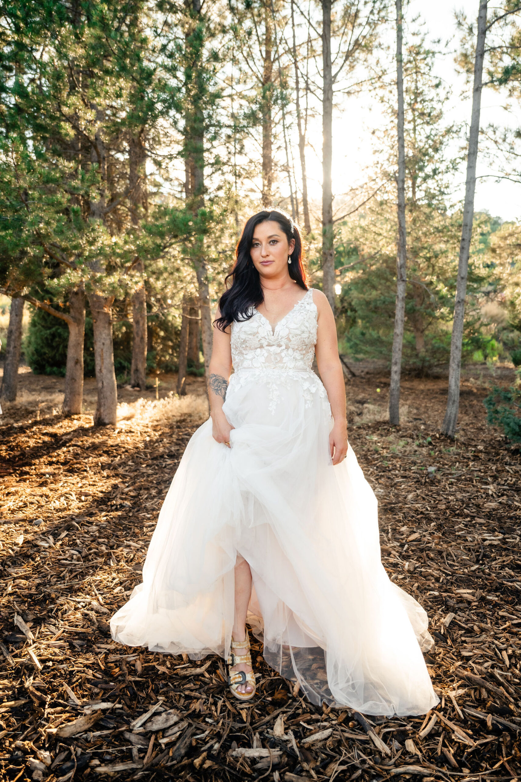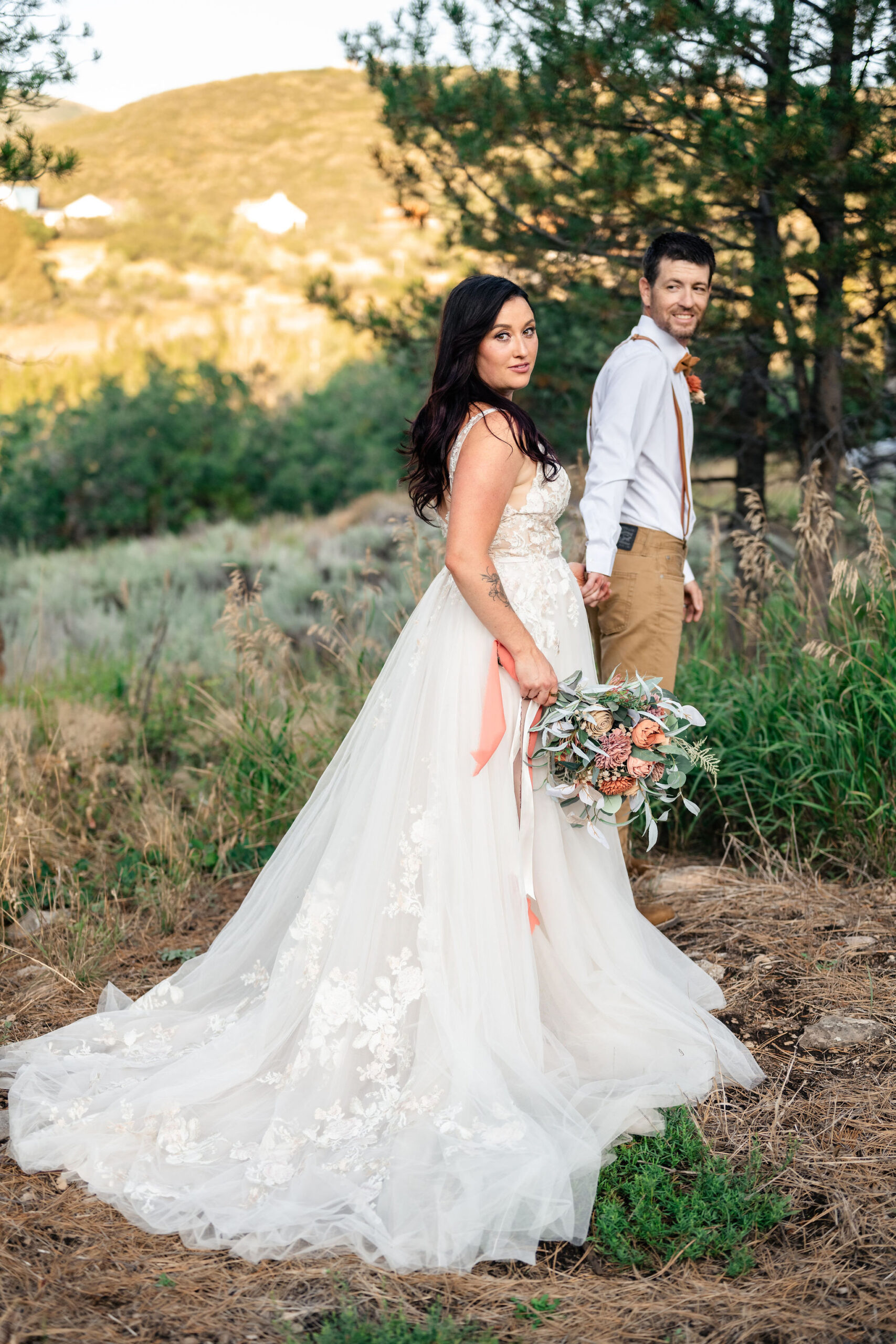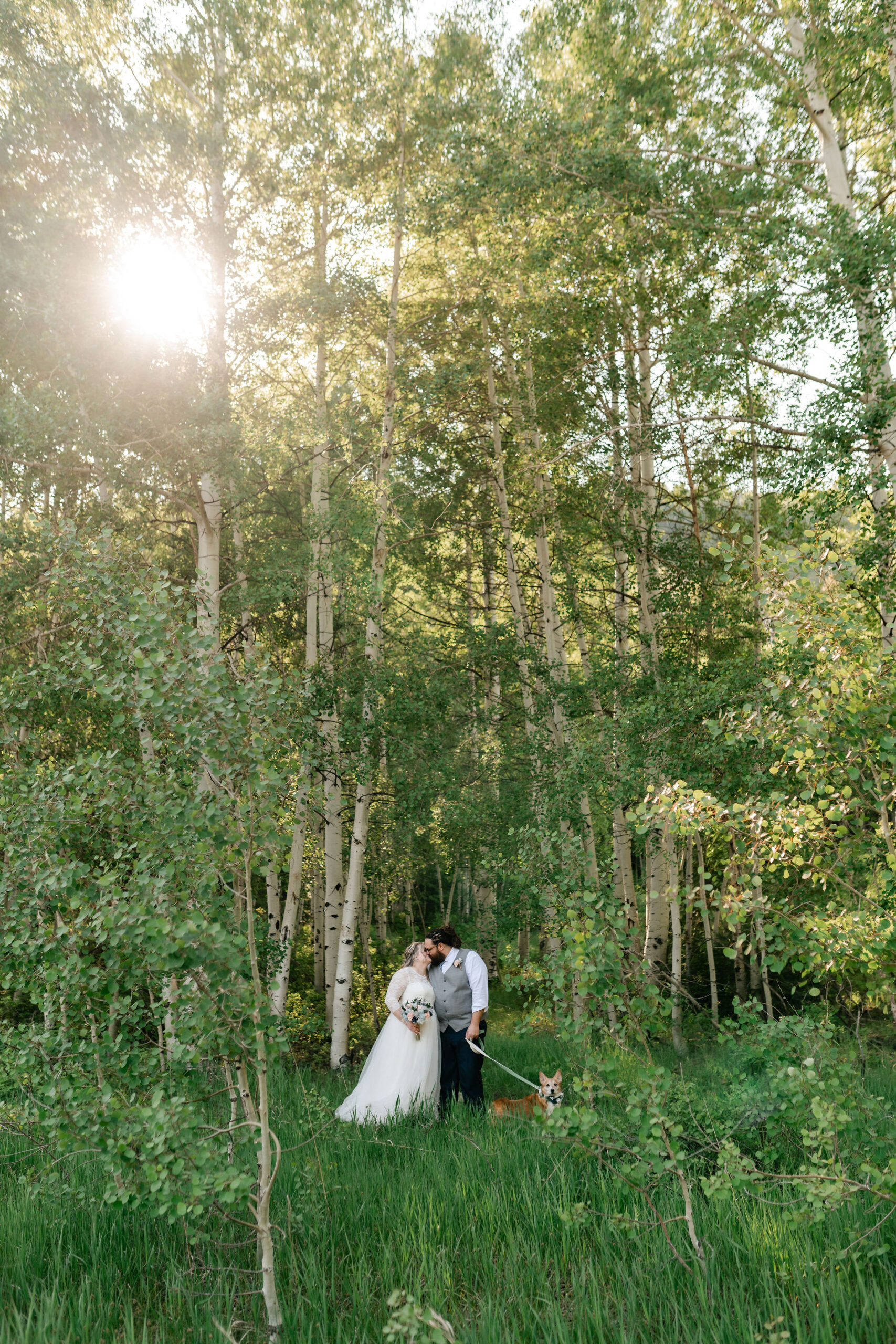 Shaylee and Tanner’s forest bridals at Aspen Grove show off its best features: it’s a little bit of everything in one place. “This spot is next to a large parking lot and features pines, aspen trees, an open area for a meadowy feel, and epic mountain views. You can walk into the trees for a much more enclosed forest feel as well.”