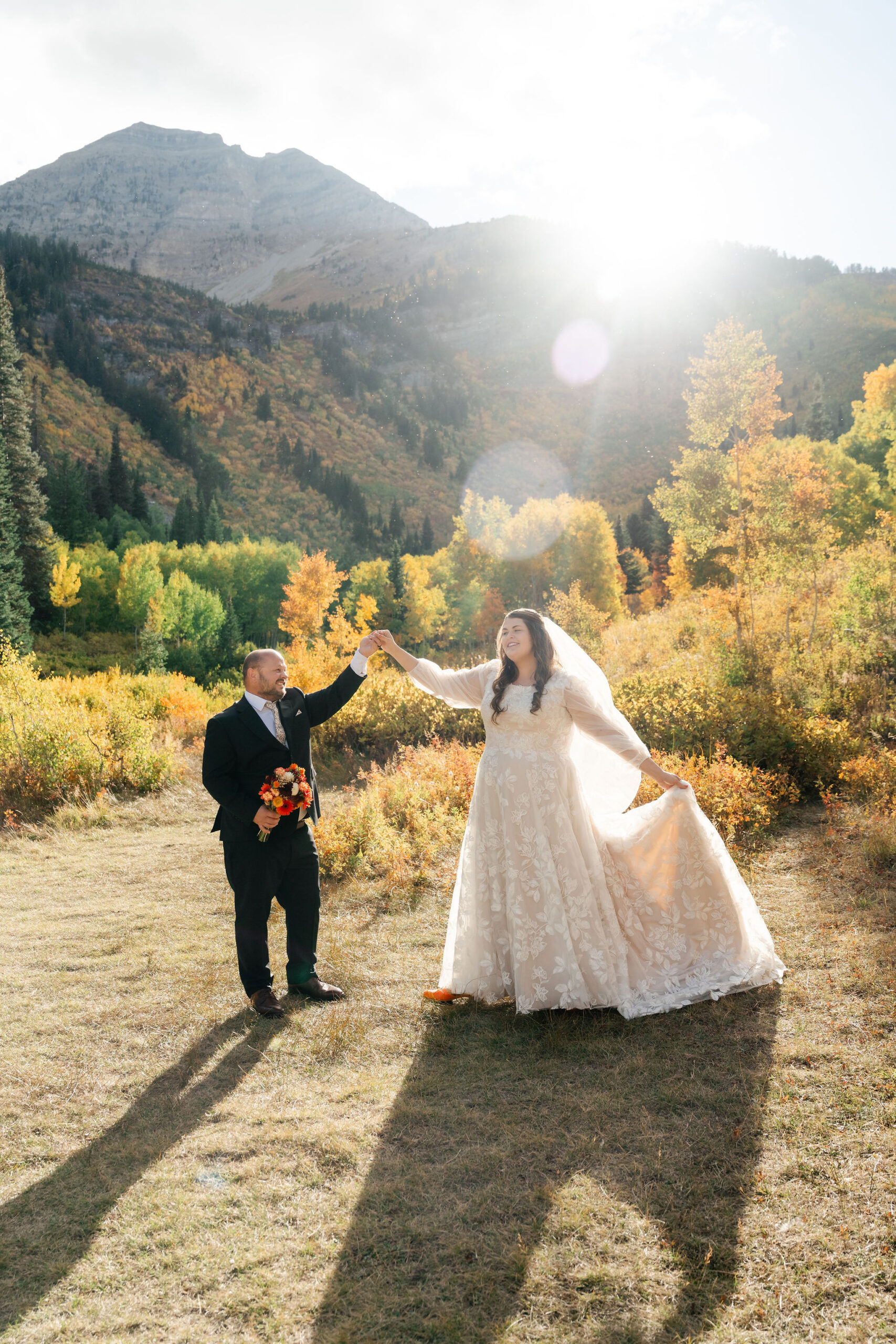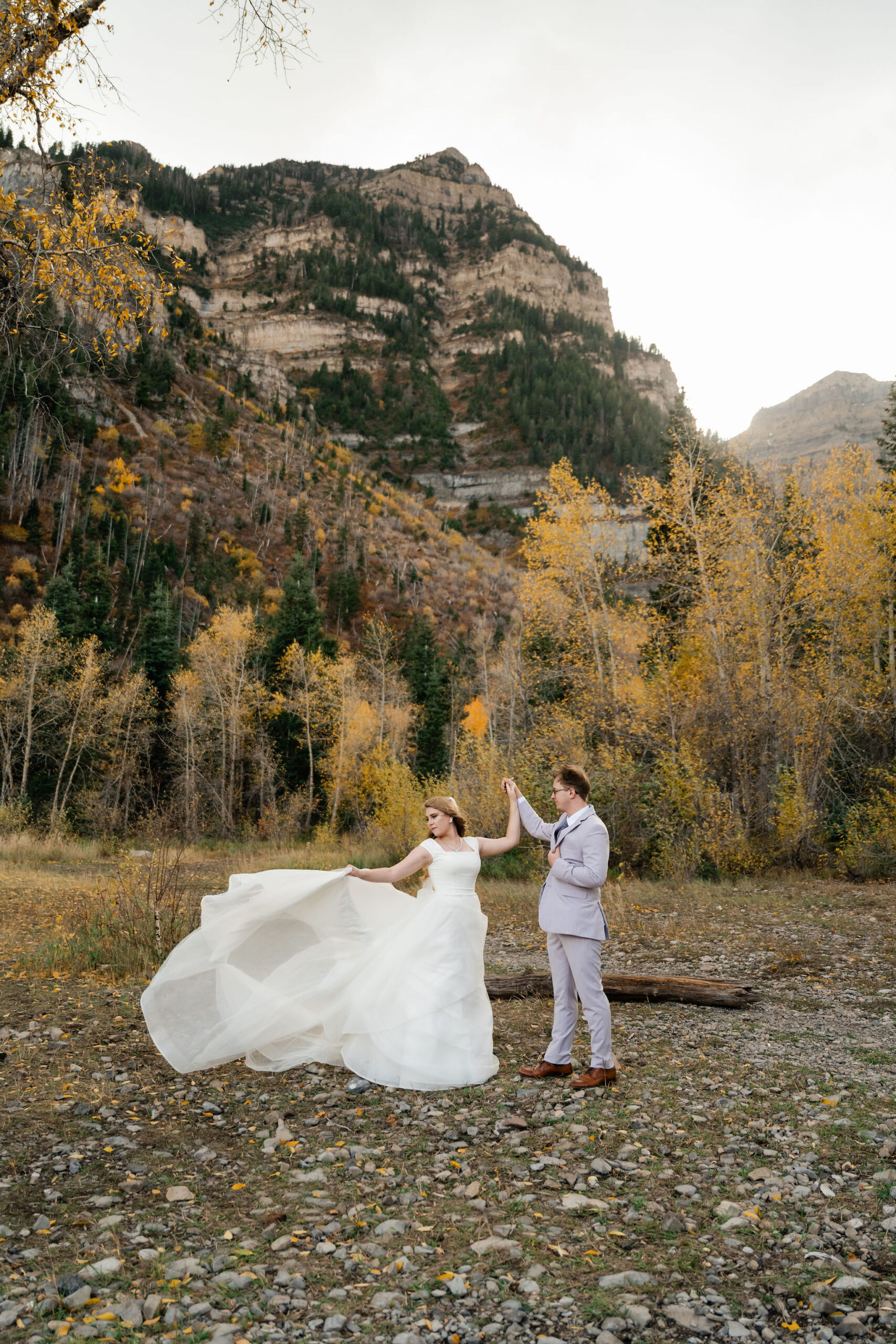 Coley says the best time overall to book your forest formals is summer and fall in Utah. “Green leaves and grasses grow back by late spring and early summer. Wildflowers bloom through summer, and the leaves will begin to change to fall colors in early fall. A dusting of snow may start to hit the high mountains in early and mid-fall, adding even more magic to your mountain session.”