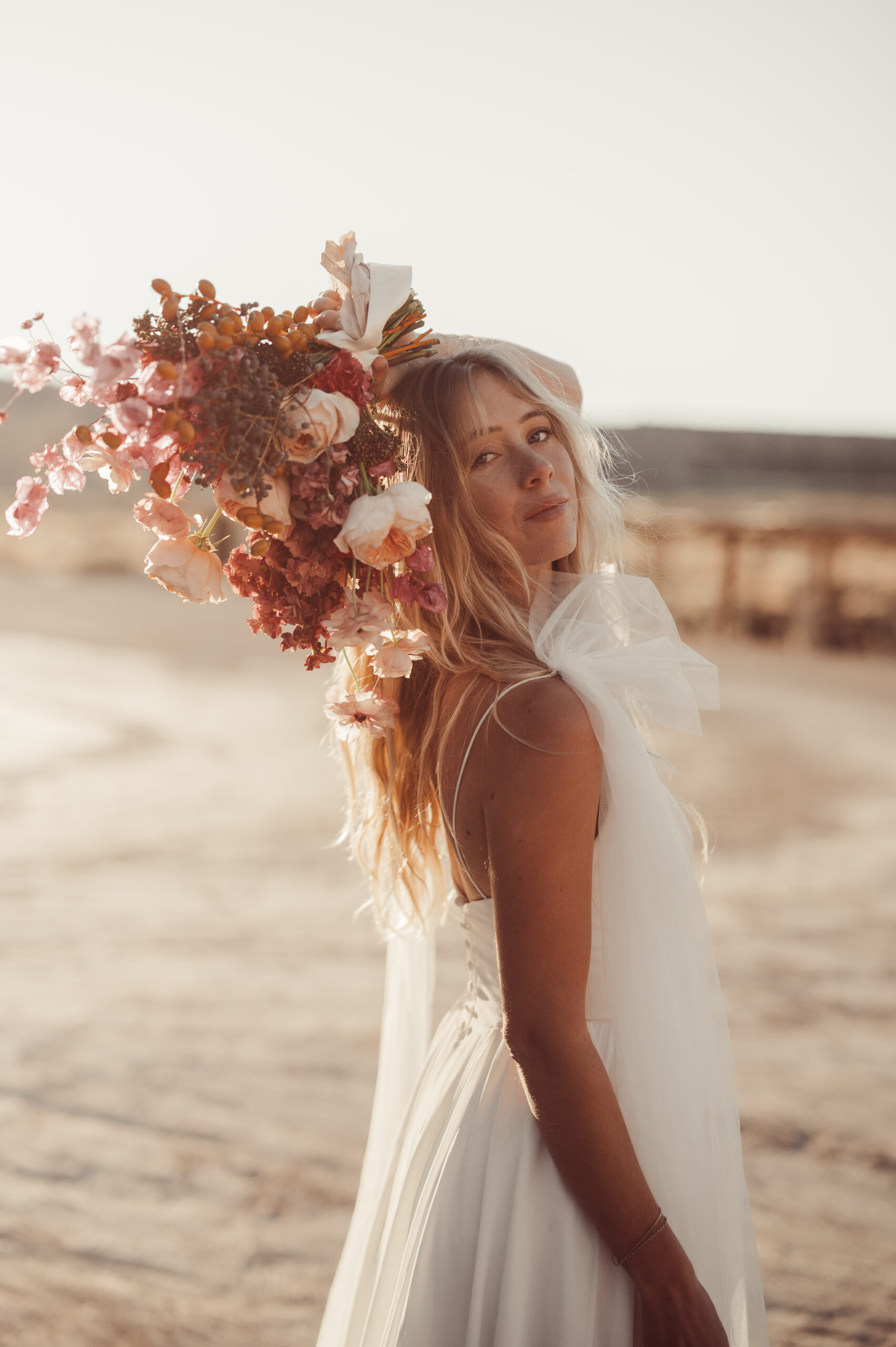 But the best part for Brittny wasnโt even the incredible choose-your-favorite options from our gowns, stationery, floral inspo, and more, but the jaw-dropping intro spread from our Pick Your Perfect section. It was a full-spread photo from the same gallery of the stunning salt flats floral arch in our florals section; and it was from the gallery that ended up being one of our 2025 covers!