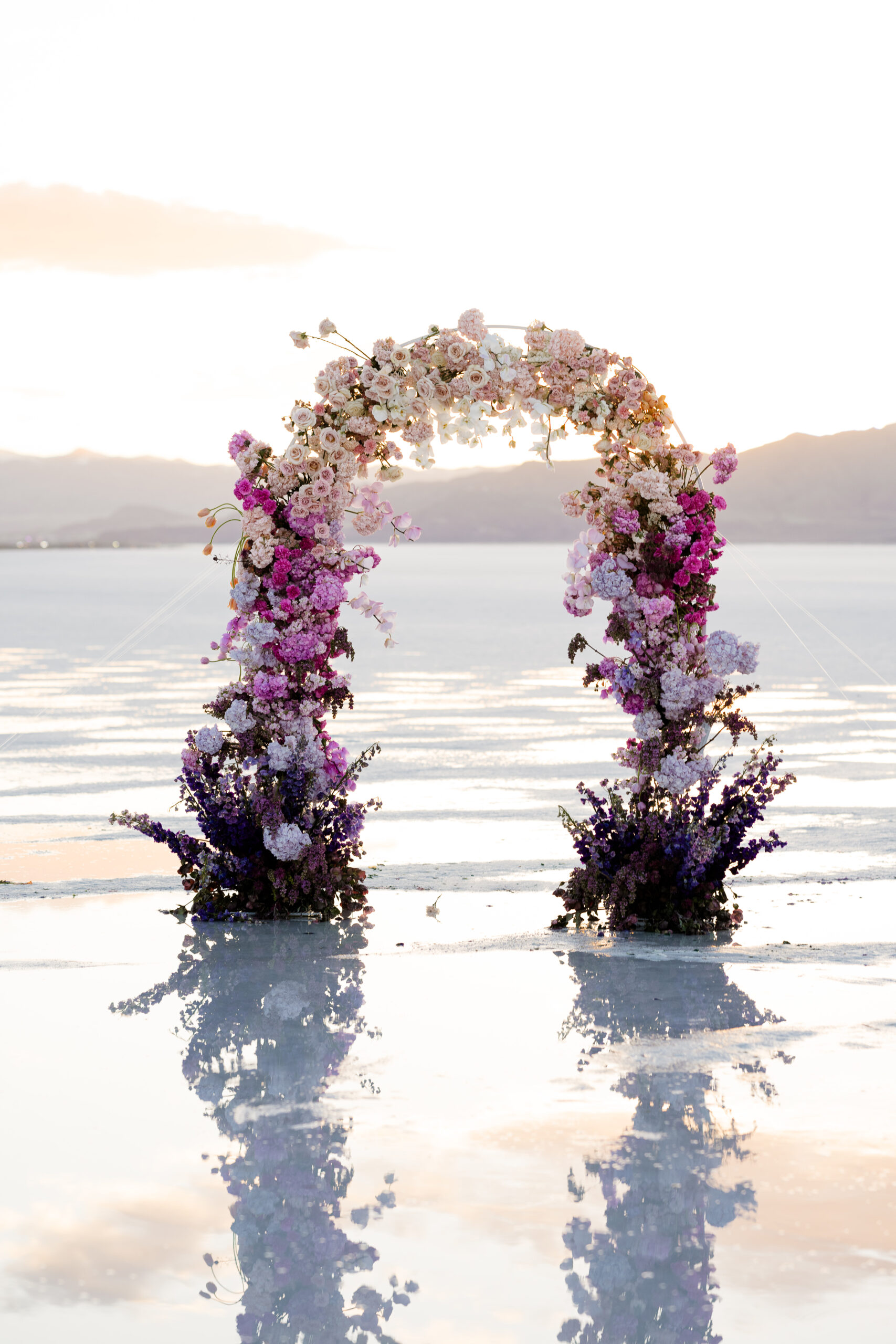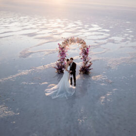 As if the stunning Salt Flats werenโt enough, this arch is a devastatingly beautiful backdrop for the moment you say your I dos. Itโs like itโs floating on water, giving us double the flowers.