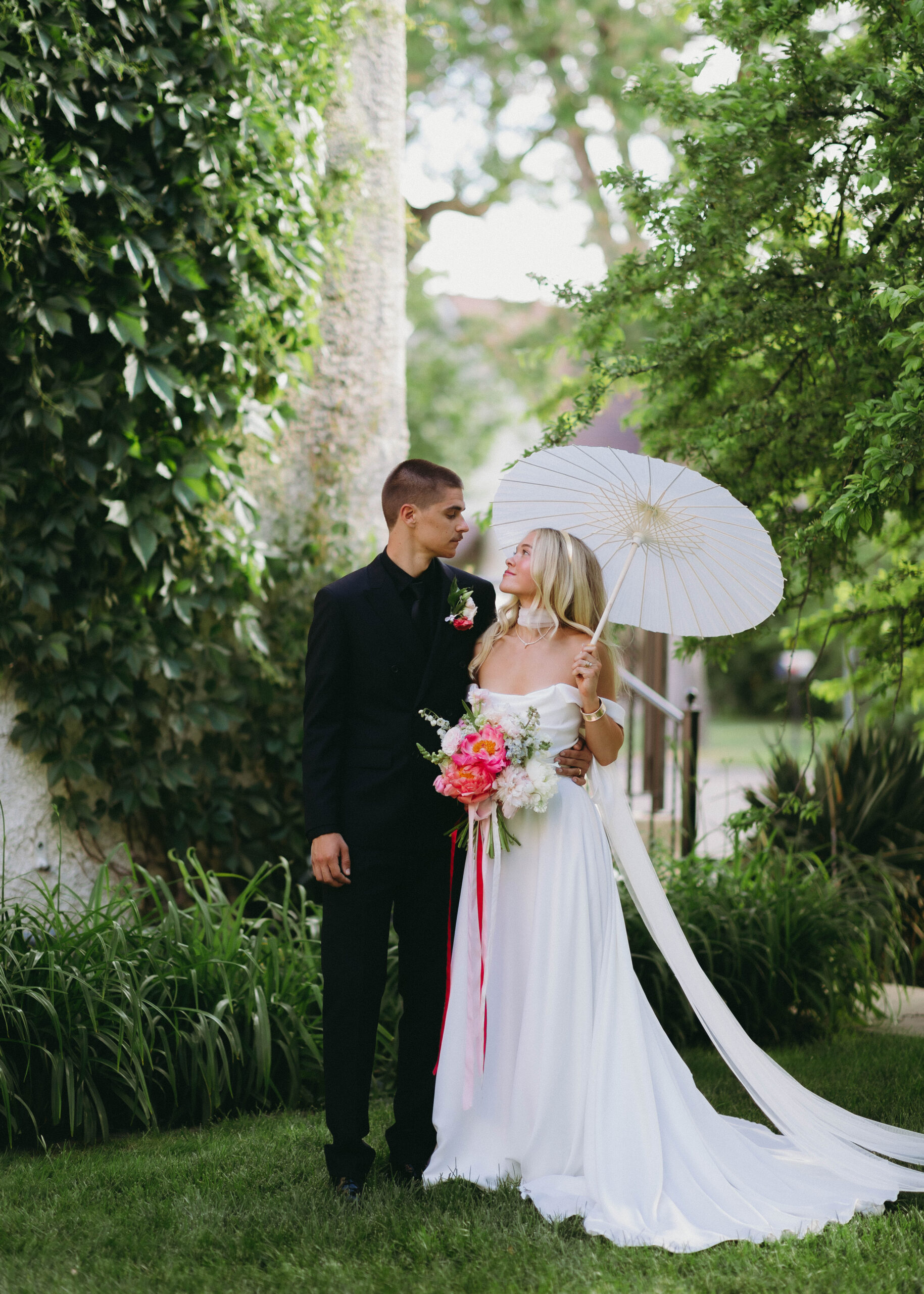 Just look at how they gaze into each otherโs eyes. The lush greens next to her vibrant florals make the whites of her dress and parasol that much more enchanting.