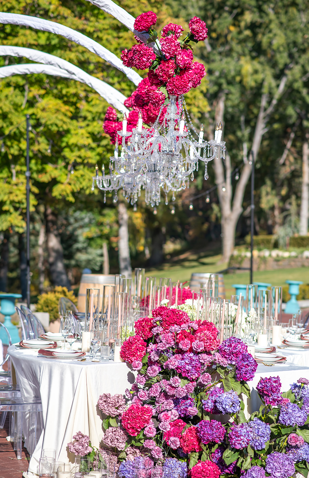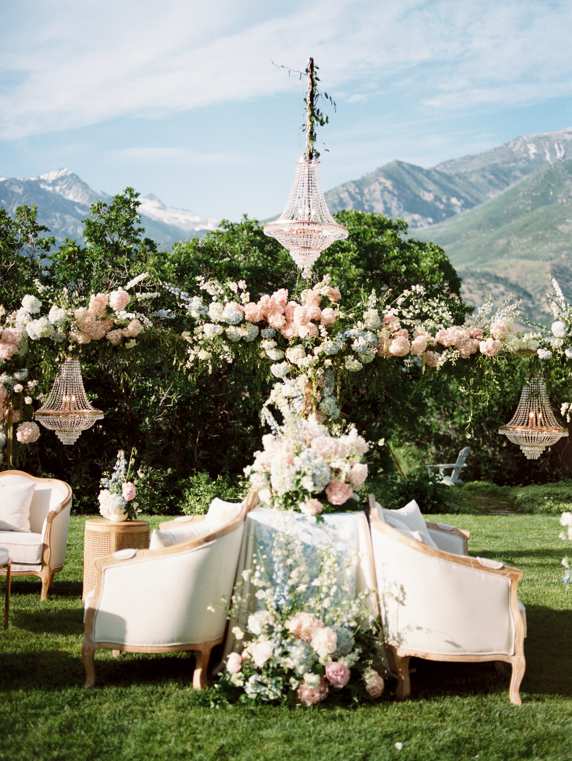 Thereโs nothing more pleasing than an indoor setting brought outside. The florals that adorn these chandeliers are the perfect way to make it all come together.