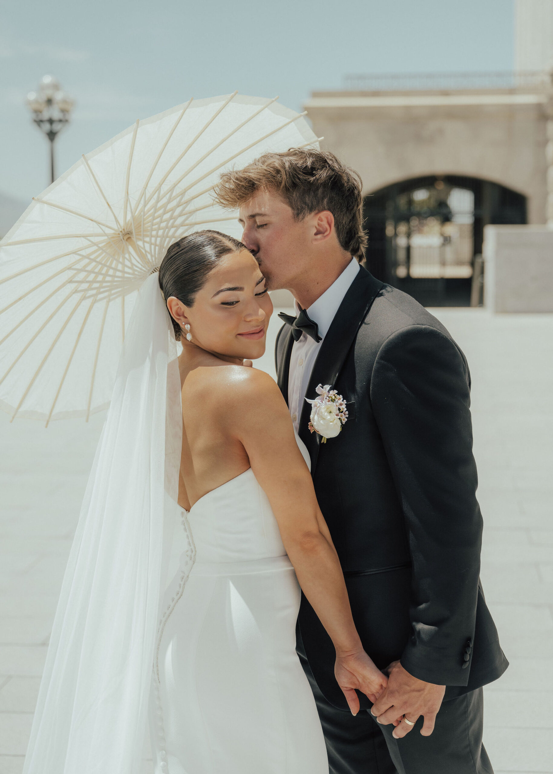 How poetic is it that that specific spot on your forehead is called a temple? This groom knows exactly what weโre talking about. And the parasol behind her almost looks like a halo.