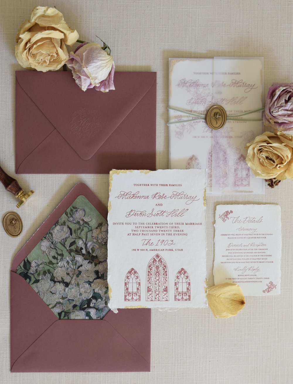 Are you seeing that floral detail on the inside of this envelope? And the roses paired with the stained glass illustration is giving Beauty and the Beast in the best way.