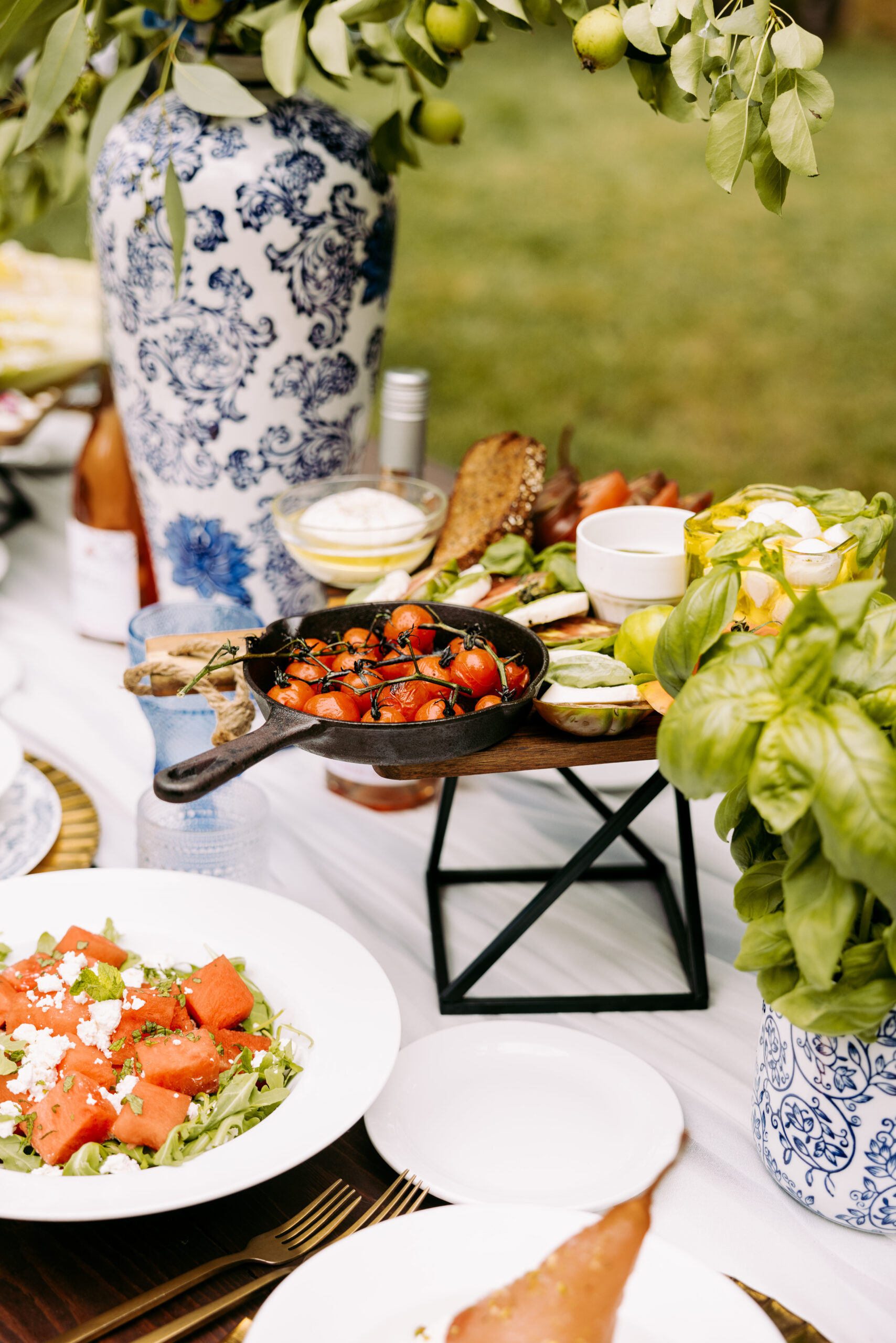 Are we kidding with the fresh basil as a centerpiece with the fresh Mediterranean-inspired charcuterie? Next to the gold cutlery and accent pieces, those vases are to die for.