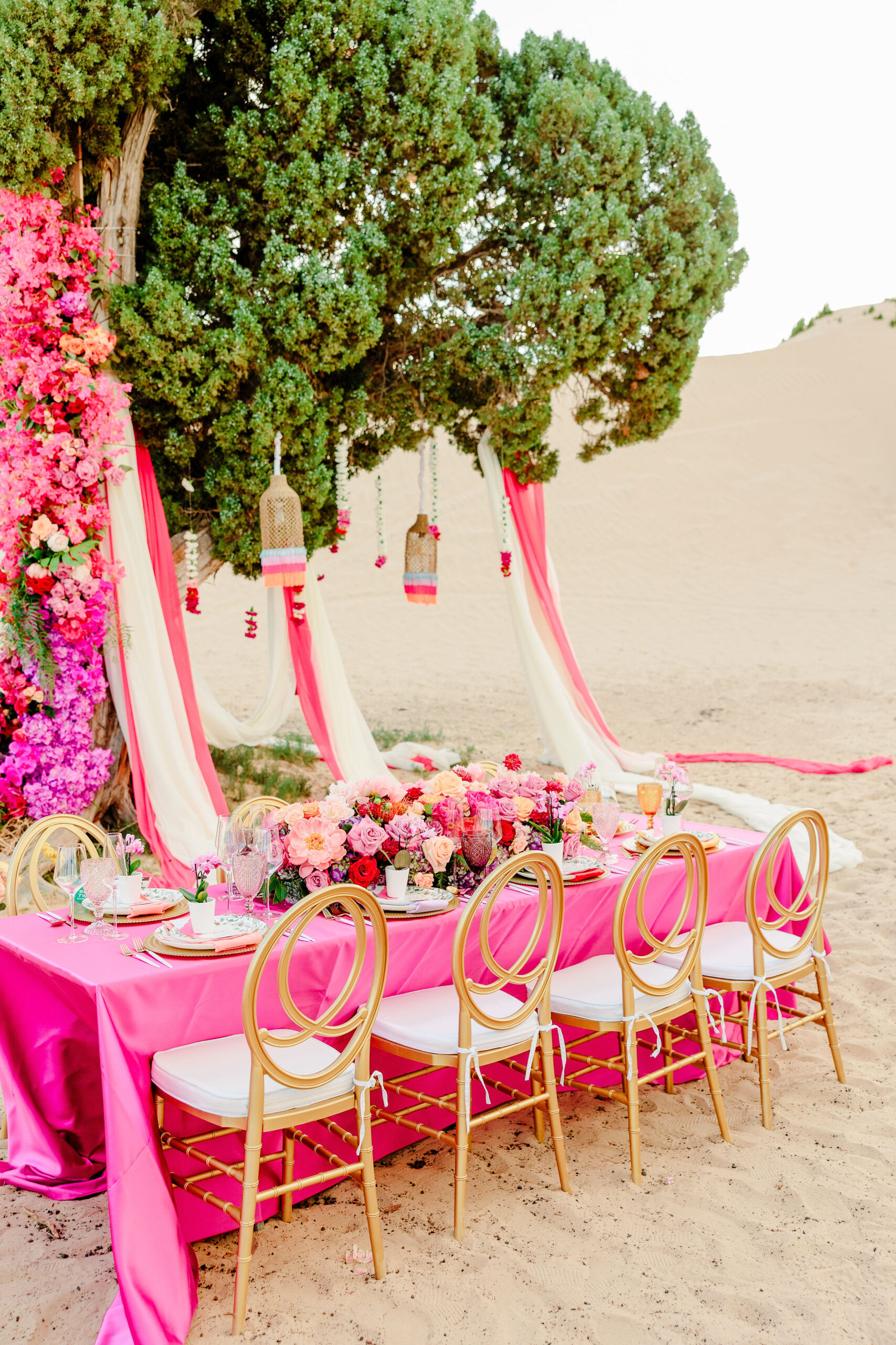 Weโve never been so floored by such a vibrant color palette. The draping linens next to the texture in those florals and the colored glassware have us needing a trip to the dunes.