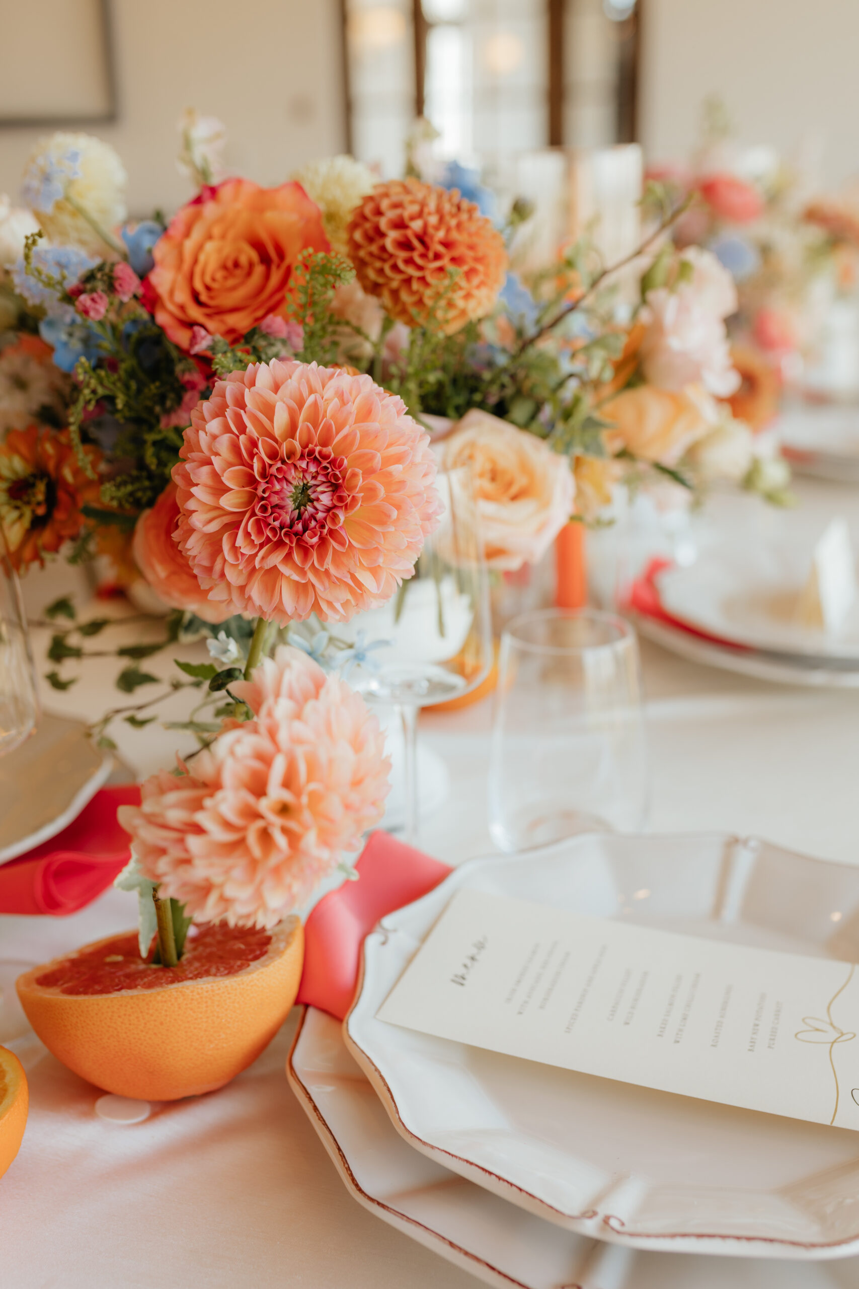 Who knew that weโd be loving blue and orange together this year? And it only gets better; this citrusy color palette tablescape features actual citrus. Hello, summer wedding inspo!