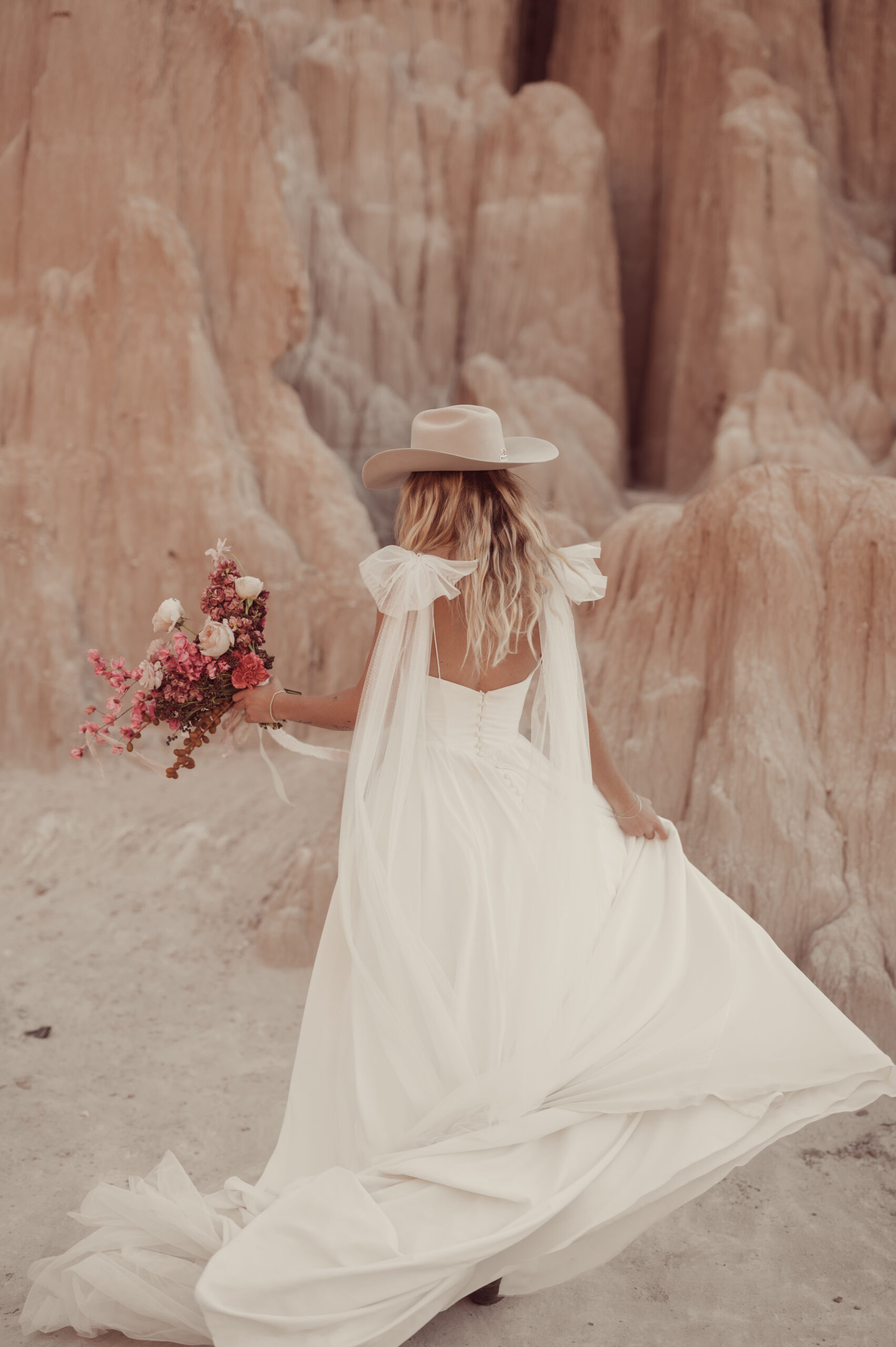 Closer to each other, and closer to falling in love. Doesn’t this floral arch make your heart flutter just a little bit? And we haven’t even mentioned her hat from PROHATS, or her boots, which tie everything together perfectly, like the beautiful bow on our bride’s dress. Who needs a veil when you have a train like this one?