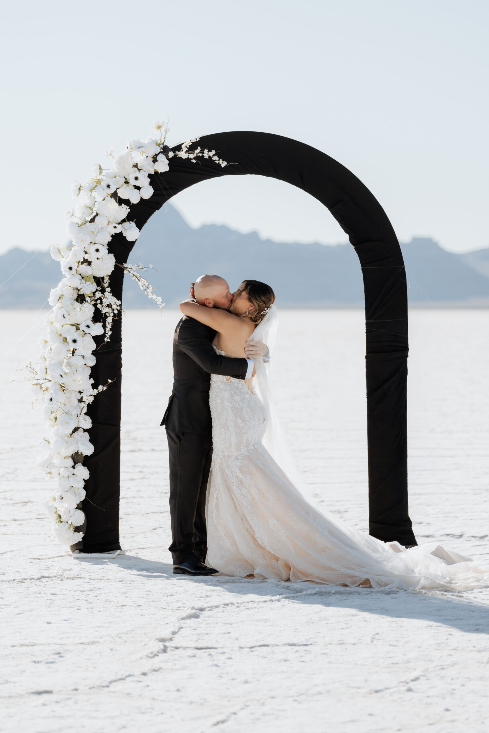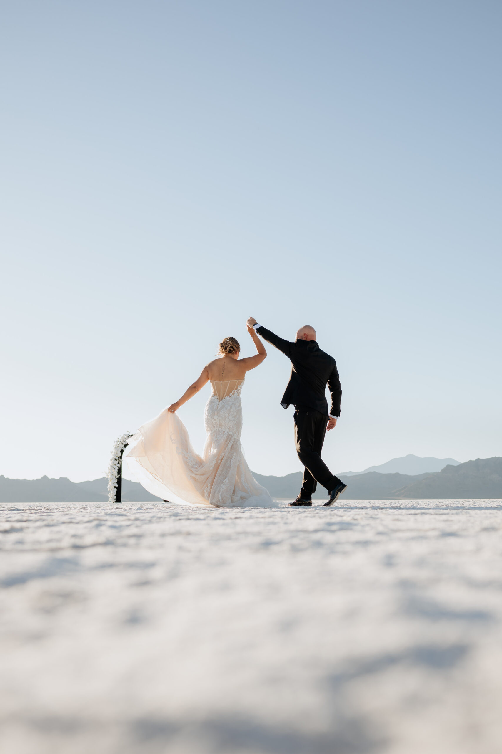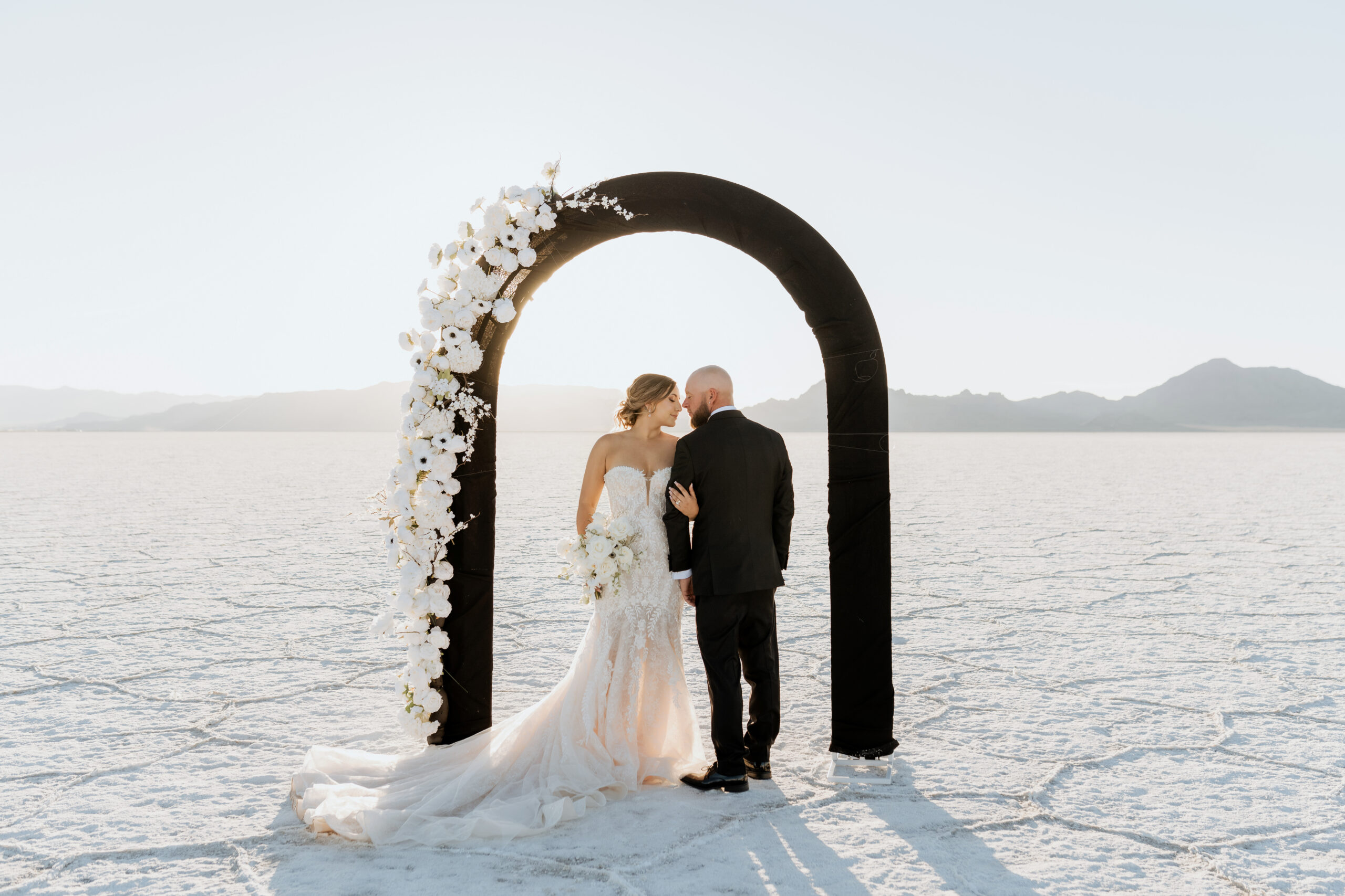 When Oriana began designing their Utah Salt Flats elopement, it all started with their colors, and the unique design of their arch followed.