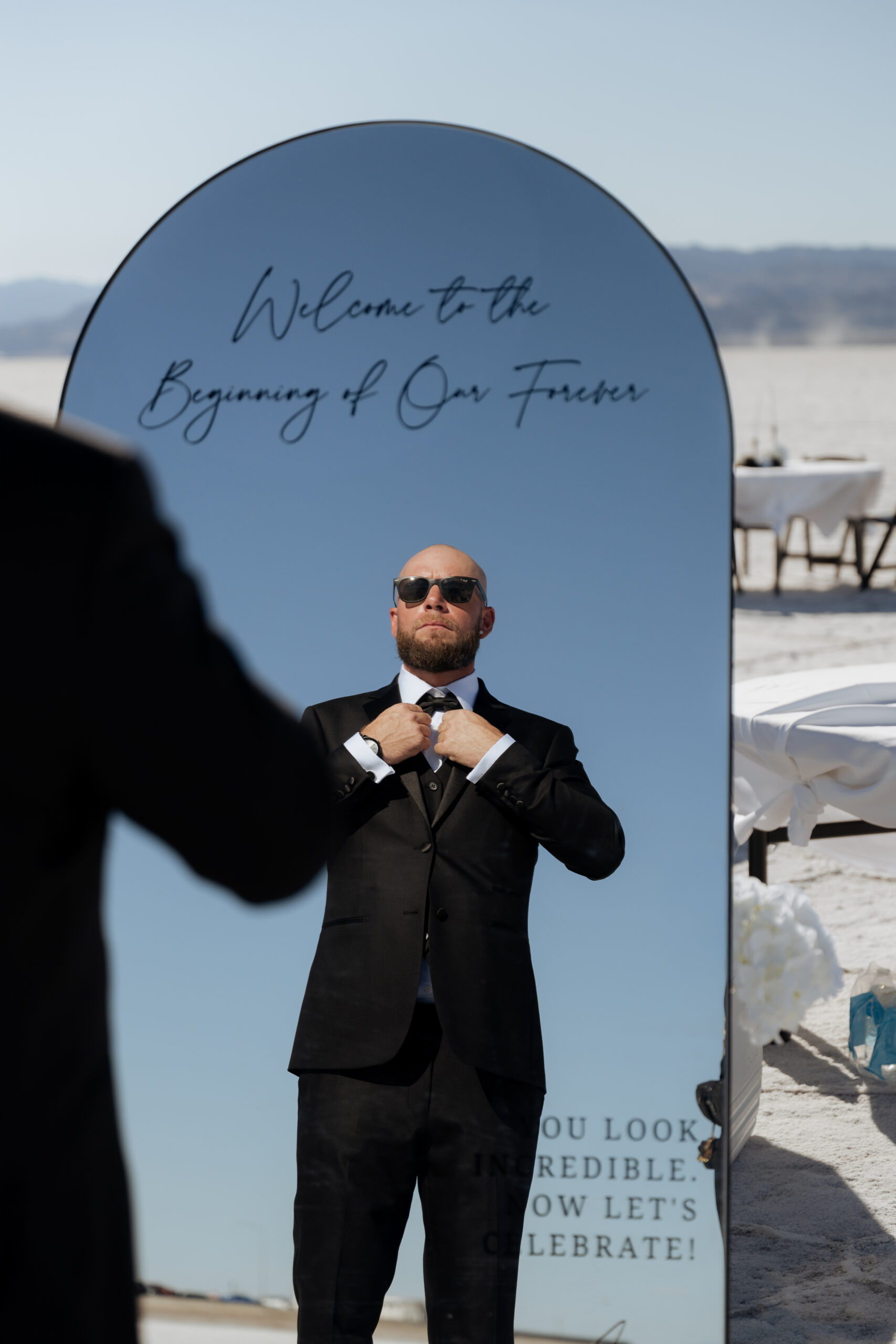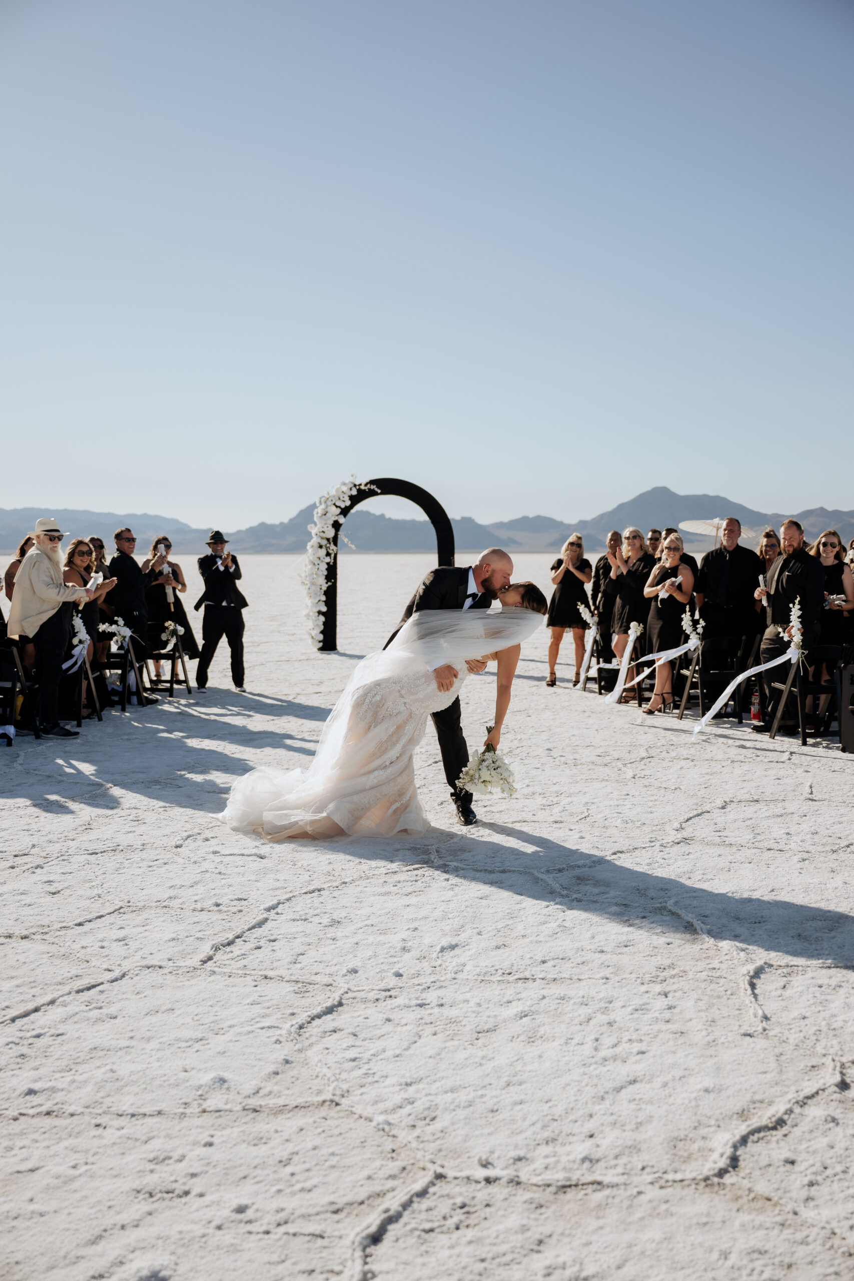 But that’s not even the beginning of how they incorporated their guests into their wedding in special ways. From their personalized name tags for everyone to the unique crystal wine glass they picked out for every individual guest, no detail was missed in curating the perfect black and white Utah Salt Flats elopement we’re worshipping.