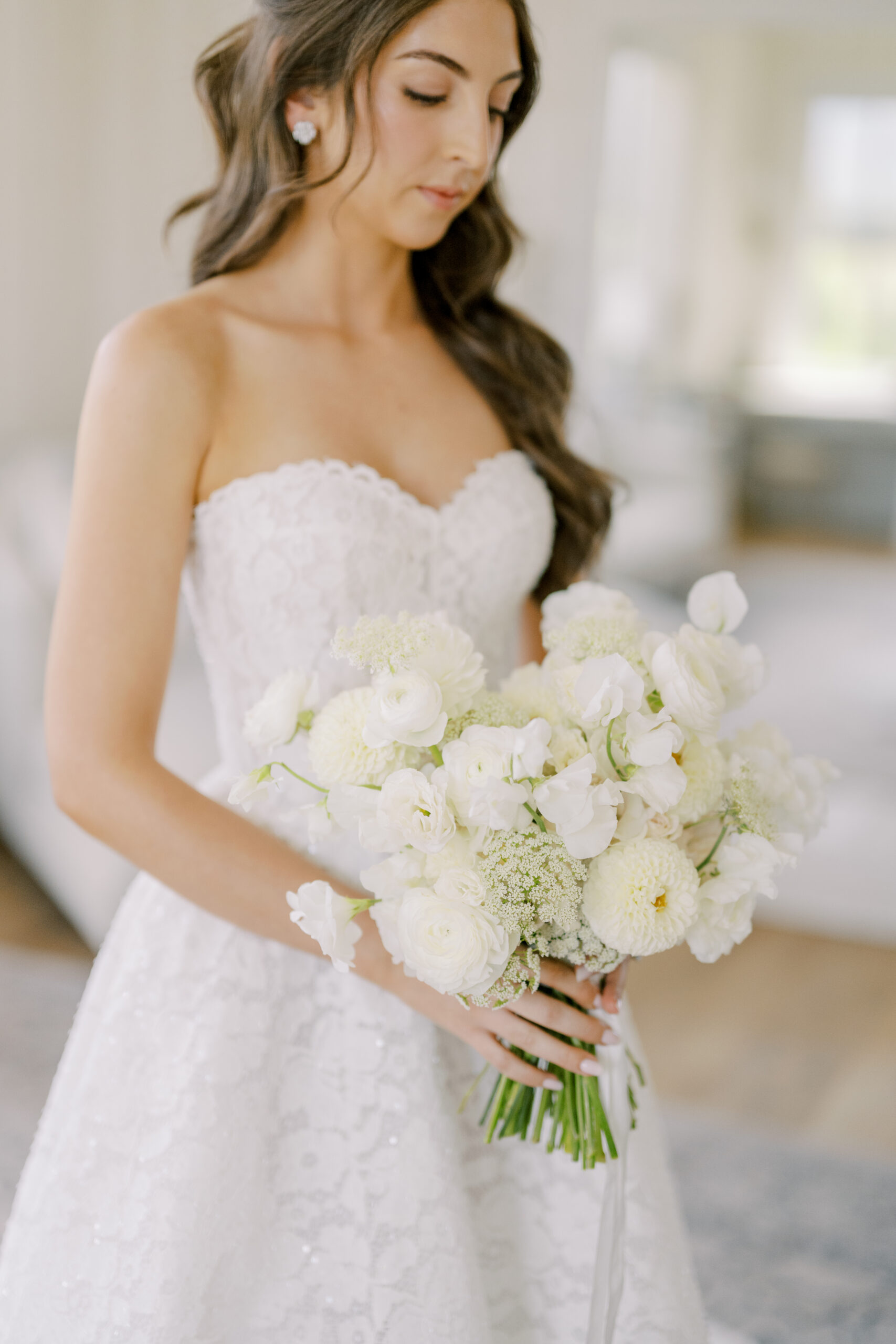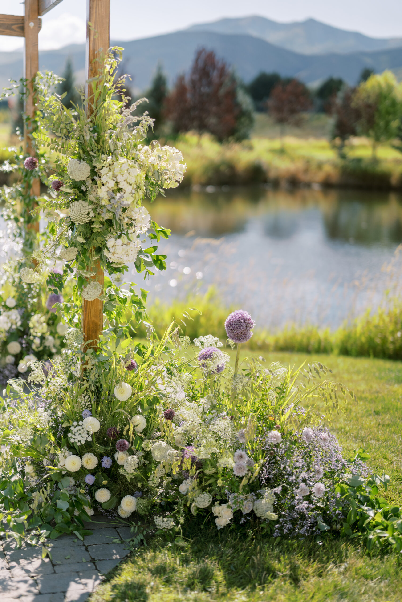 “I always knew I wanted light and airy white and green, and some texture with it. I saw a photo of allium, which is the purple flower that was incorporated into the ceremony, and when I saw those flowers, I knew that’s what I had to do. It’s perfect. And also seasonal. So I just felt like it brought some level of dimension into the green and white, whereas everything else was green and white. I felt like it tied it together.”