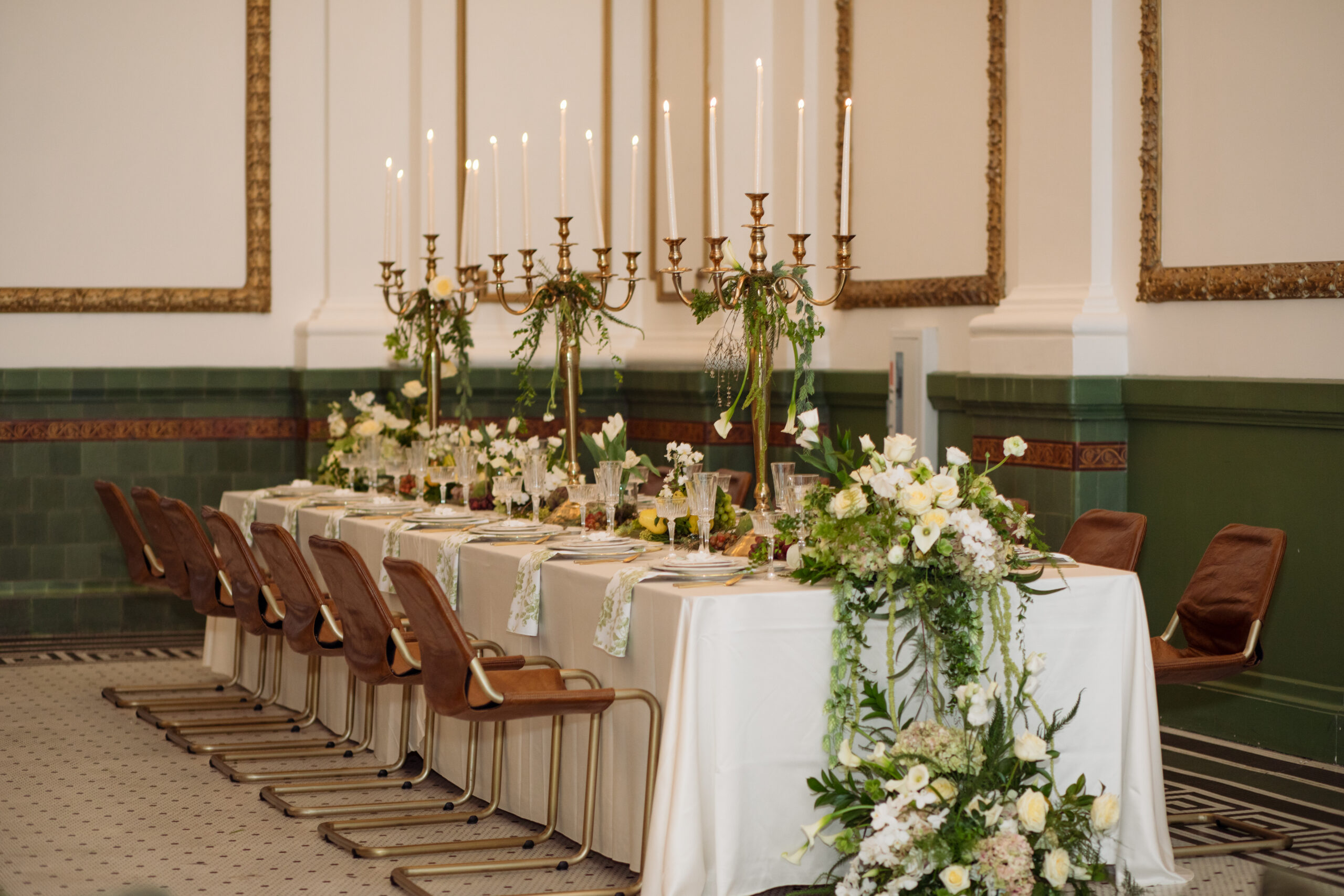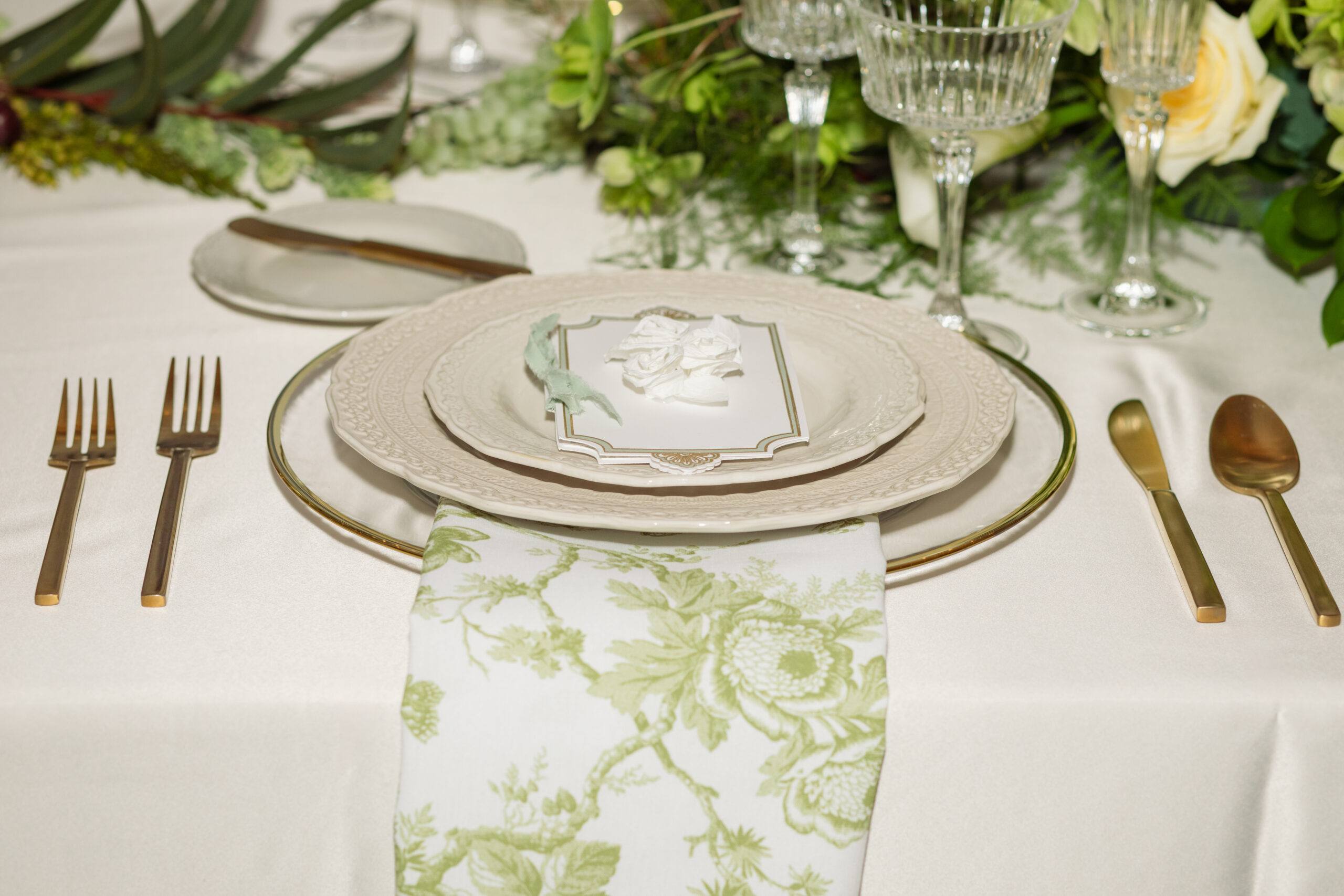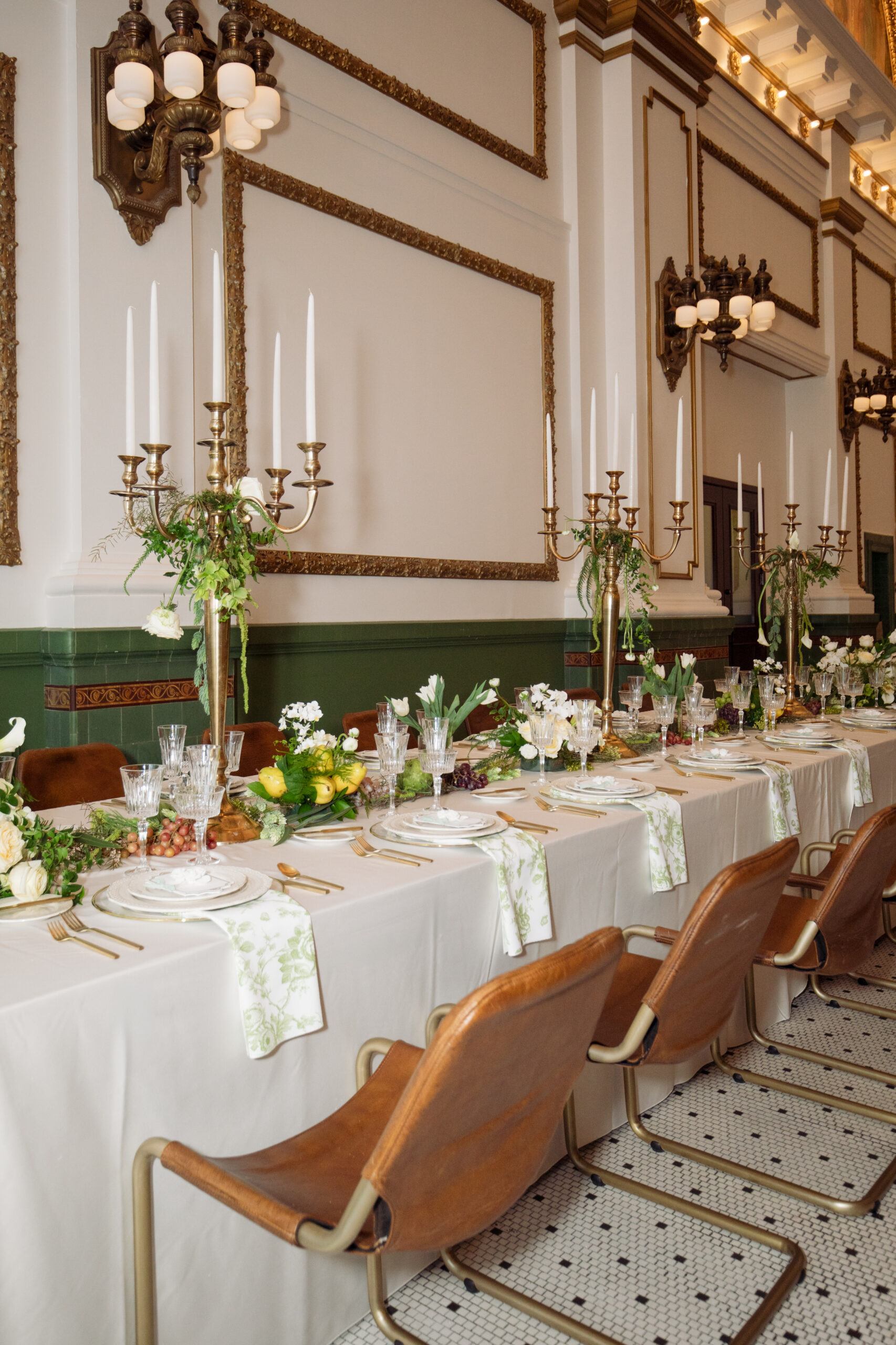 The stunning reception space, complete with tiled floors and green and gold accents along the wall, is made even more awe-inspiring by the rentals and decor from Diamond Event & Tent. What better way to bring your vintage wedding look together than with giant gold candelabras and old French toile textures? And the design on these beautiful ivory plates really levels up this wedding from nice to exquisite.