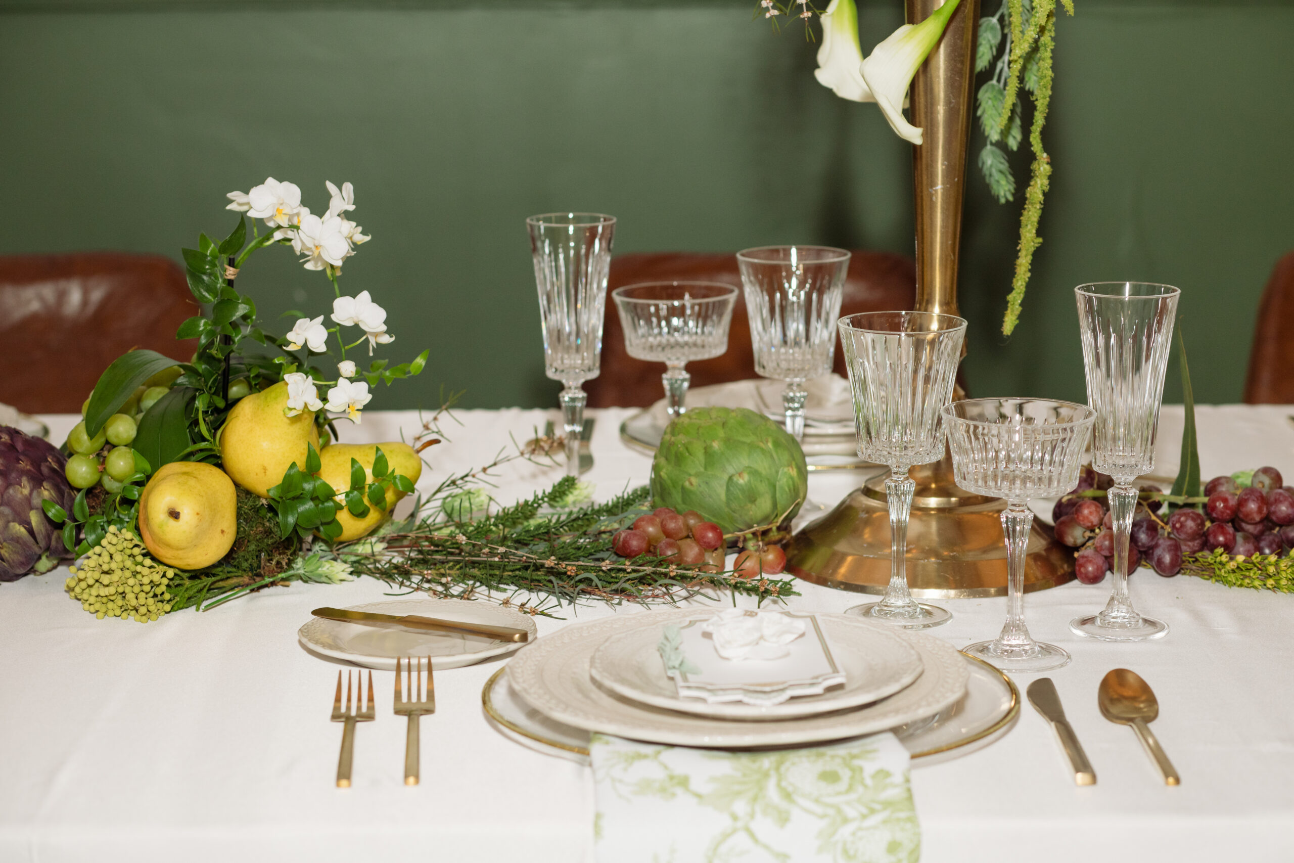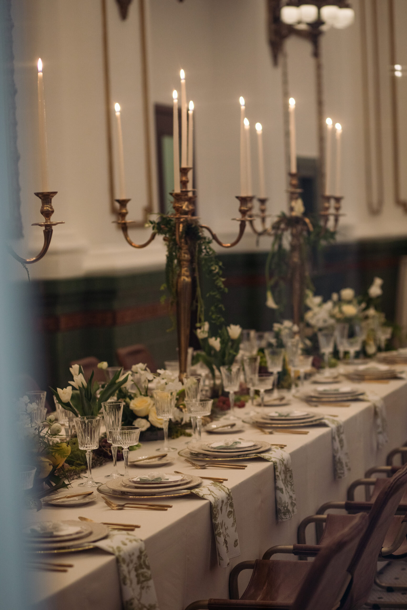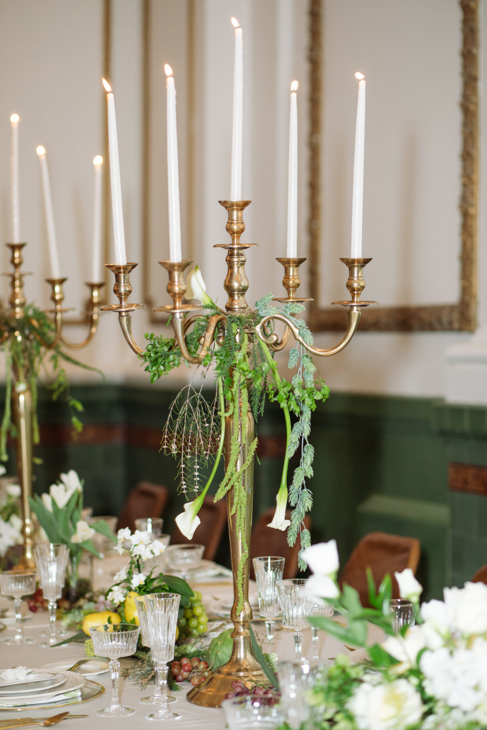 The stunning reception space, complete with tiled floors and green and gold accents along the wall, is made even more awe-inspiring by the rentals and decor from Diamond Event & Tent. What better way to bring your vintage wedding look together than with giant gold candelabras and old French toile textures? And the design on these beautiful ivory plates really levels up this wedding from nice to exquisite.