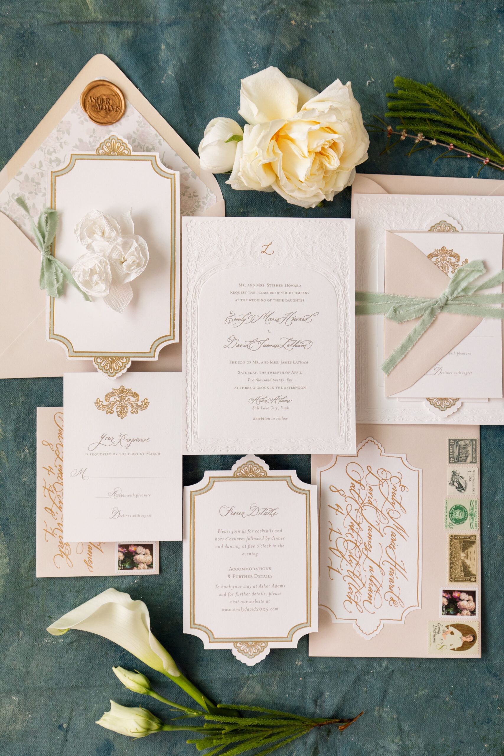 That’s not the only detail we’ll never stop obsessing about, though. The incredible stationery (featured in our 2026 magazine!) from Throughtfully Yours is inspired by the actual walls of The Asher Adams itself, with gold accents and early twentieth-century shapes paired with spring colors and elegant lettering. It’s like an invitation to travel back in time.