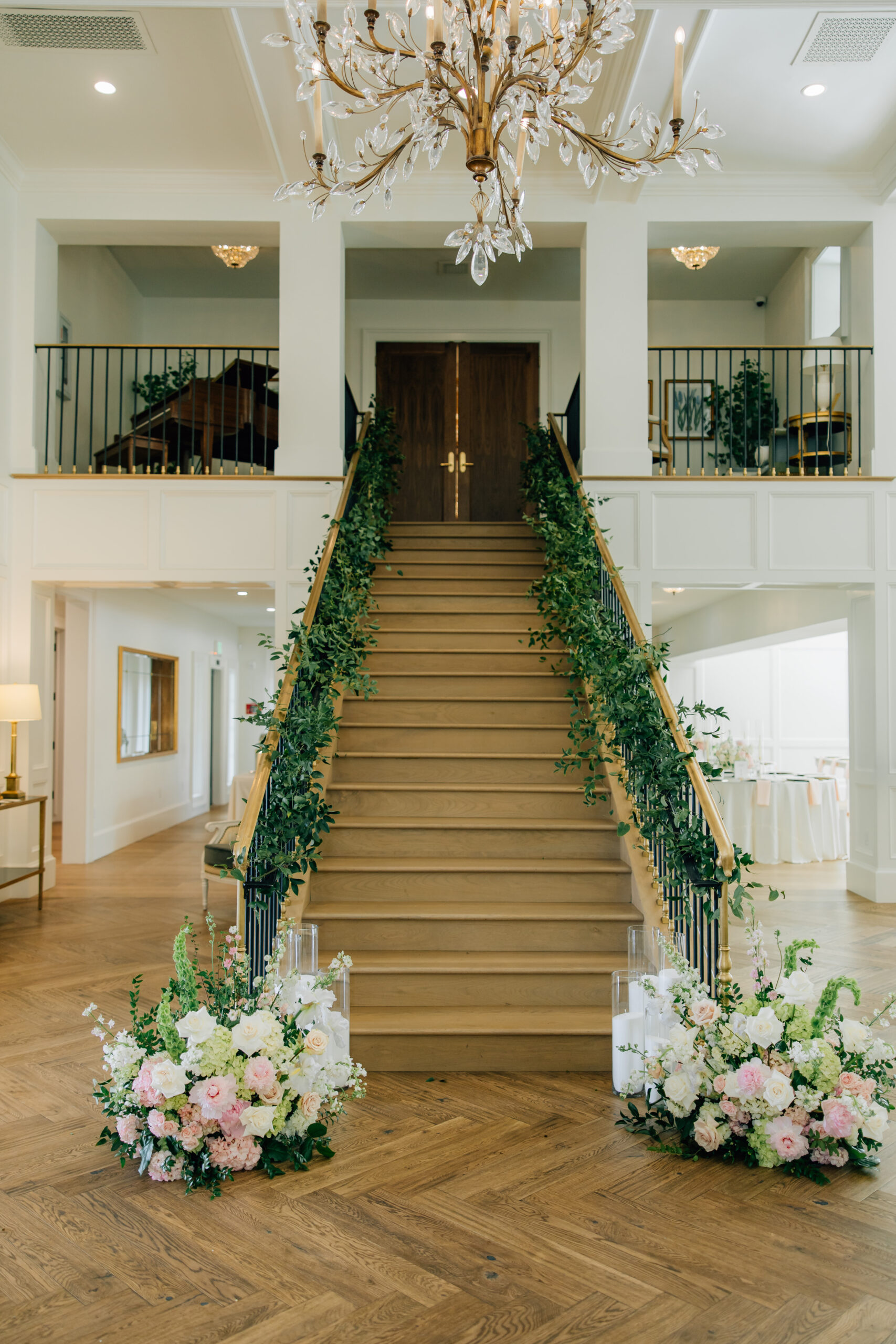 When it came to choosing their wedding theme and aesthetic, Rachel and Dan wanted it to feel “classy, clean, timeless, and elegant,” with lots of greenery as their inspo. And the green vines you see wrapping down the grand staircase match the vines on Rachel’s iconic wedding dress, right from Kleinfeld in New York.